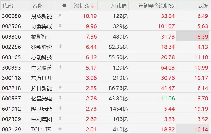 3月17日,A股市场光伏概念股普遍走强。其中,易成新能股价大涨超过10%,协鑫集成强势封于10CM涨停板,福斯特涨幅超过7%。兆新股份、芯能科技均录得超过6%的涨幅,中来股份上涨超过5%,东方日升涨逾3%。此外,拓日新能、亿晶光电、隆基绿能、中利集团以及TCL中环等个股也均有超过2%的涨幅。