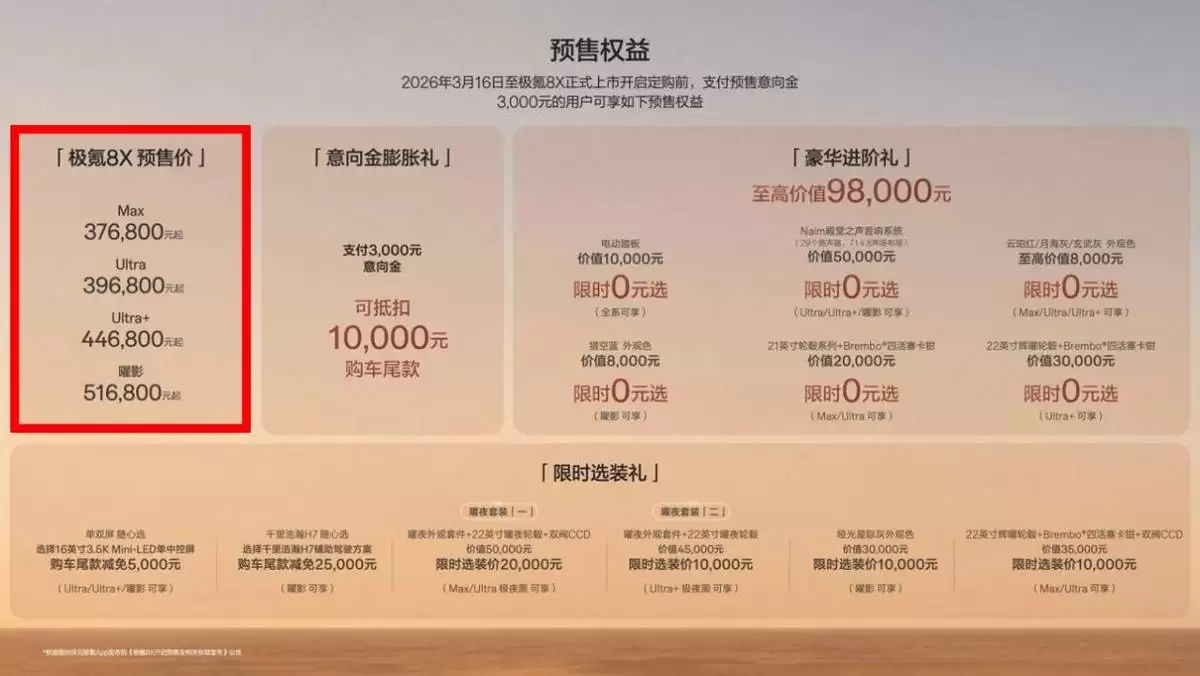 3月16日,极氪旗下全新高性能旗舰SUV——极氪8X正式开启预售,预售价区间为37.68万元至51.68万元。这一价格在中大型新能源SUV市场引发了广泛关注,顶配车型突破50万元大关,展现出十足的勇气,而其丰富的配置也让不少消费者直呼其为“价格屠夫”。