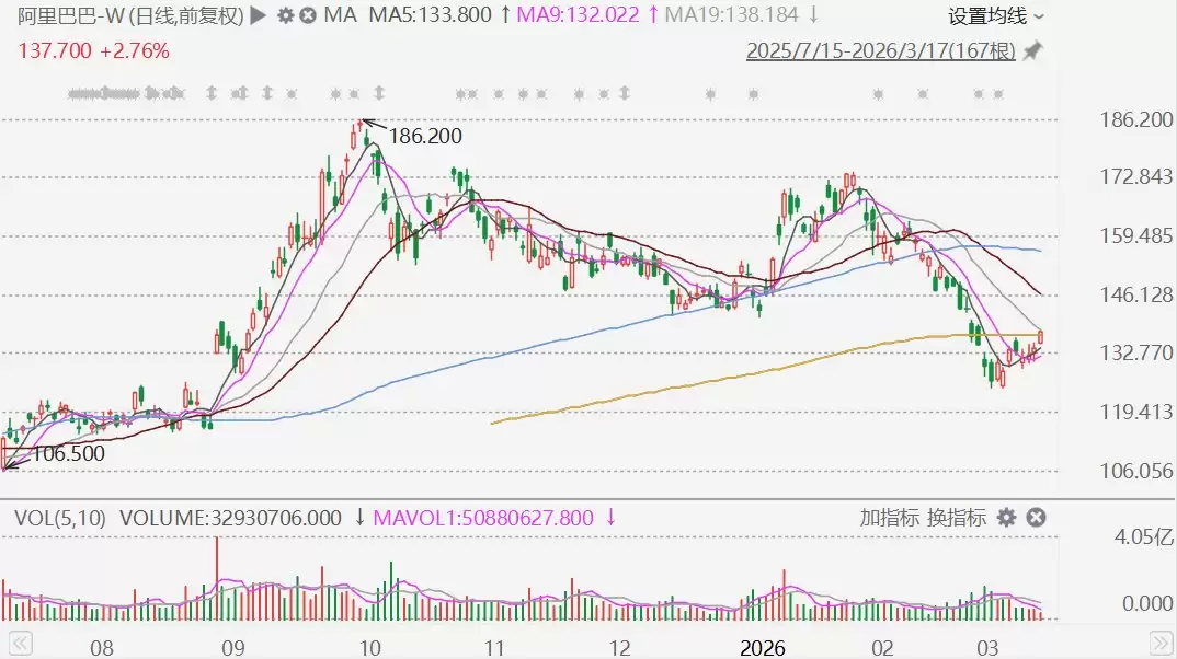 3月17日,阿里巴巴港股表现强劲,盘中涨幅一度超过3%,股价升至138.2港元。