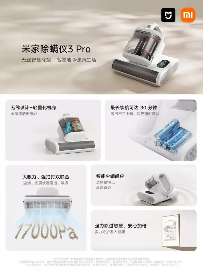 从官方商品页面获悉,米家除螨仪3 Pro采用无线设计,机身重量轻至1.7千克,彻底告别电源线束缚,轻松省力;升级高速无刷电机,吸力高达17kPa;可实时监测尘螨浓度,整机过滤效率达99%;还支持快充技术,最长续航时间可达30分钟。