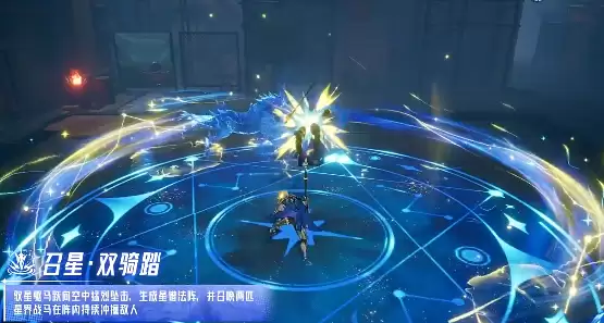 5、召星·双骑踏:鞍星驱马跃向空中猛烈坠击,生成星谱法阵,并召唤两匹星界战马在阵内持续冲撞敌人。