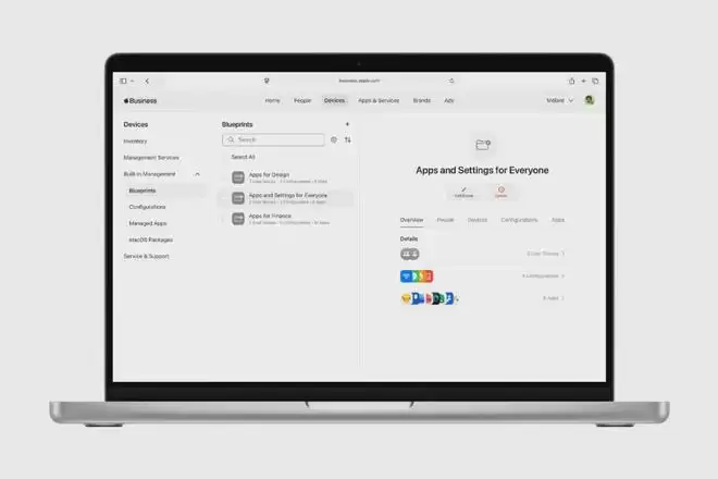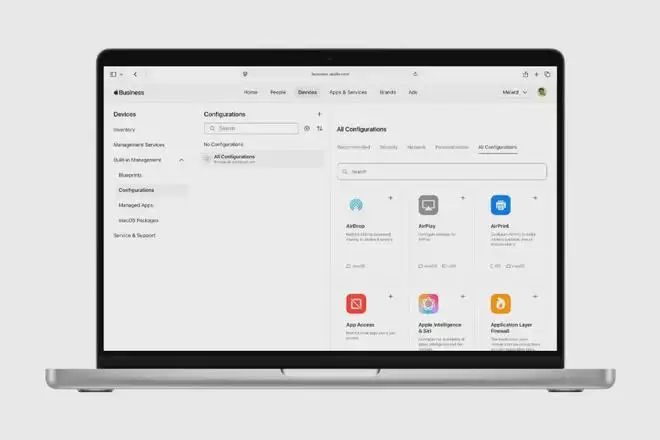 现在,管理员在Apple商务后台创建“预设集”。比如“销售组”预设:自动安装CRM App、强制开启锁屏密码、禁止安装非企业App。“财务组”预设:安装财务软件、禁用摄像头、开启两步验证。员工拿到新iPhone,开机后输入公司账号,所有配置自动下载,全程不需要 IT 人员碰设备。苹果管这叫“零接触部署”。