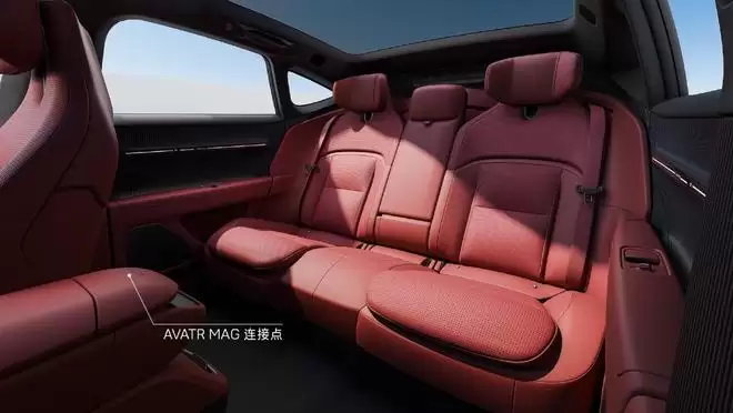 车内大面积使用软包材质,顶棚升级为天鹅绒材质,质感进一步提升。前排车门区域经过优化,增加了开放式储物空间,门板扶手处也新增了应急拉手和车窗开关按键。同时,DMS疲劳驾驶预警系统有所升级,后排还增加了AVATR MAG连接点,扩展了使用场景。