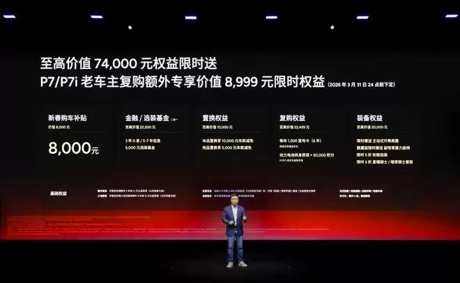 即日起至2026年3月31日24点前下定小鹏P7,用户可享受至高74,000元的配置限时送权益,包括价值8,000元的新春购车补贴,并可二选一享受5,000元选装基金,或3年0息/5-7年低息的金融购车权益;同时,置换用户可获至高10,000元置换权益,复购用户可享至高22,499元复购权益。在外观方面,小鹏提供了至高价值20,000元的装备权益,两款新色套装及轮毂选装的限时半价优惠,主动式升降尾翼限时赠送,购买鹏翼版车型的朋友还可额外获赠副驾零重力座椅。
