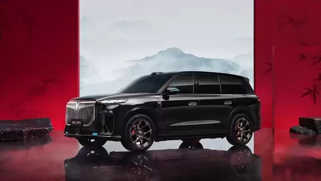 外观采用全黑车漆加全套熏黑套件,玄镜万象格栅用全镜面高光黑化工艺打造,周围景色在格栅上流转映照,营造出一种“藏锋于从容”的气场。内饰则以大面积“丹墨”为底,座椅缝线、头枕处点缀“丹砂”红色,墨晶按键采用黑水晶材质与钻石切割工艺,流云墨韵饰板则用光影技法呈现出水墨晕染的意境。