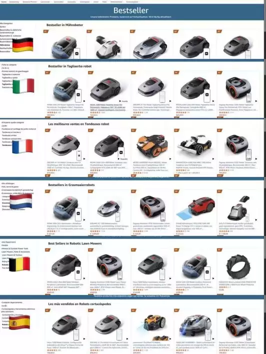 过去几年,扫地机器人、洗地机等智能清洁产品彻底把室内清洁卷到了极致,但在欧美市场,不仅是室内还有室外,也就是草坪护理。最近,MOVA ViAX 系列割草机器人登顶Amazon德国、意大利、西班牙等多个站点 Best Sellers 榜单,其中意大利站销量同比增长超过 1290%,德国站更是达到 2360% 的增幅。同时在欧洲建材连锁渠道 BAUHAUS 中,MOVA 也长期占据销量第一的位置。