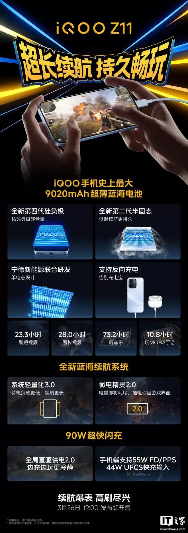 iQOO Z11 还配备 iQOO 手机史上最大 9020mAh 超薄蓝海电池,支持反向充电 & 90W 超快闪充,搭载蓝厂自研全新蓝海续航系统,宣称“高清高帧玩 MOBA 手游,长达 10.8 小时”。