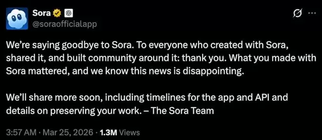智东西3月25日报道,今日凌晨,OpenAI旗下视频生成产品Sora通过最新账号宣布关停,关闭其视频生成应用及Sora 2模型API服务。与此同时,价值10亿美元的迪士尼合作也一并告吹。