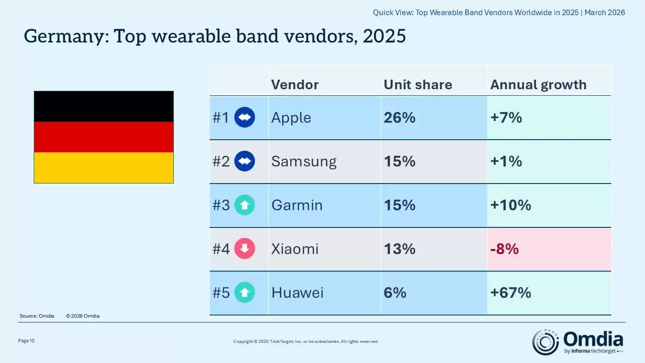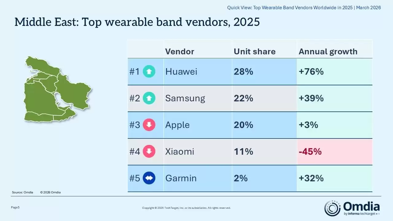 苹果紧随其后,以17%位列第二,华为以16%排名第三。市场整合趋势明显,前五大厂商还包括三星(9%)和佳明(5%),其中前三名之间竞争尤为激烈。