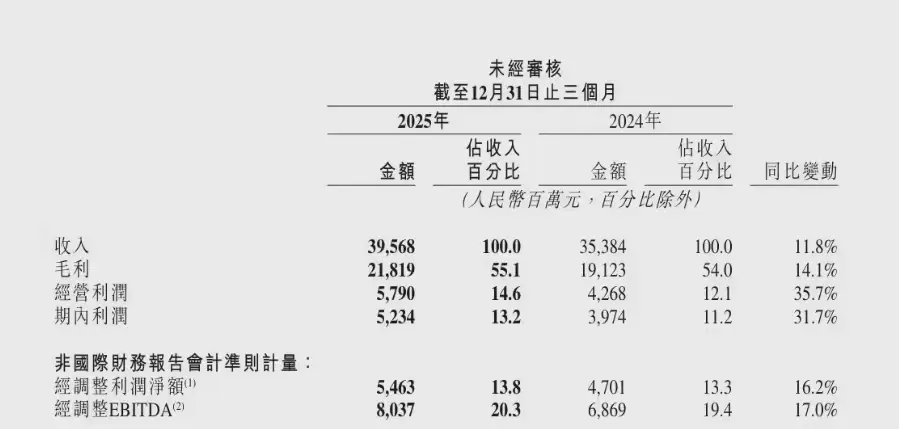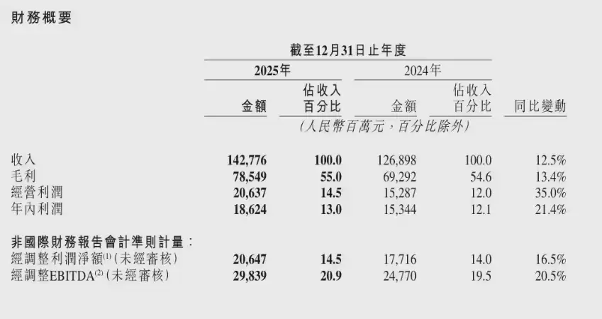 数据显示,公司全年实现营业收入1428亿元,同比增长12.5%;净利润186.2亿元,同比增长21.4%;非国际财务报告准则下经调整利润净额206.5亿元,同比增长16.5%,经调整净利润率为 14.5%。