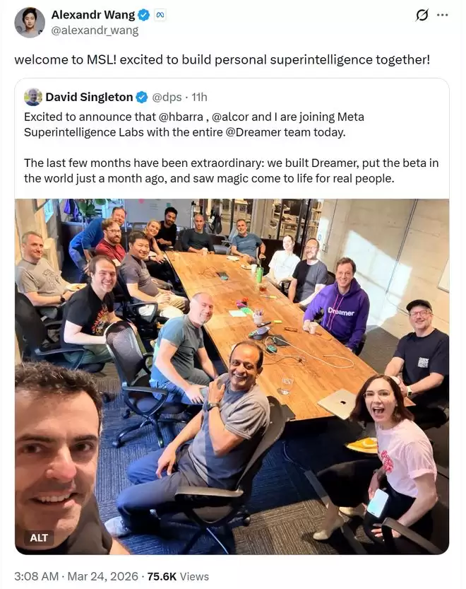 智东西3月24日消息,Meta首席AI官亚历山大·王(Alexandr Wang)今日在社交媒体X平台宣布,Meta已将AI智能体初创公司Dreamer的创始团队以“收购式招聘”的方式悉数揽入旗下超级智能实验室,共同推进AI智能体及相关项目研发。据彭博社报道,知情人士透露,Dreamer仍作为独立法律实体存在,Meta获得使用Dreamer技术的非独家许可。Wang也是Dreamer的个人投资方。