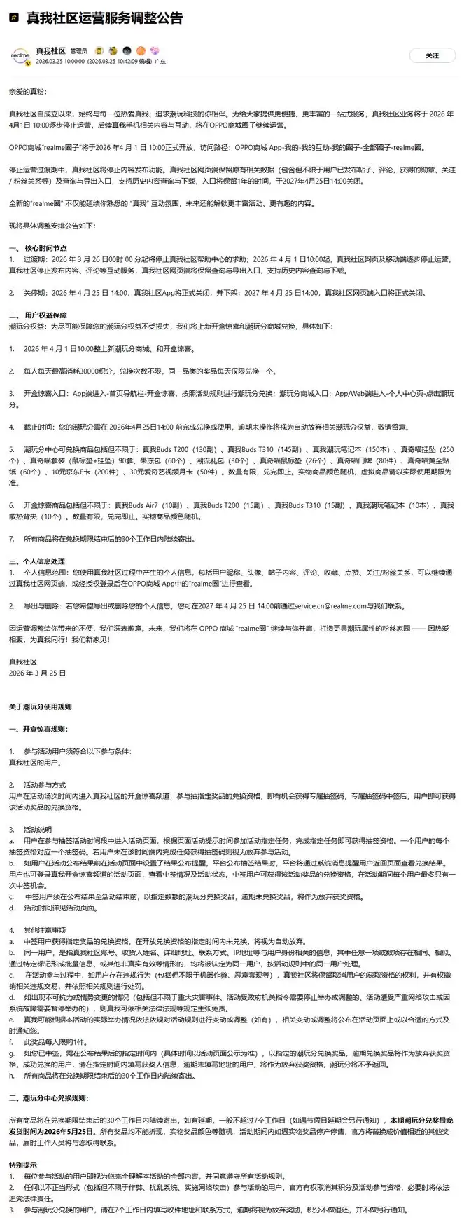 真我社区管理员表示,停止运营过渡期中,真我社区将停止内容发布功能。真我社区网页端保留原有相关数据(包含但不限于用户已发布帖子、评论,获得的勋章、关注 / 粉丝关系等)及查询与导出入口,支持历史内容查询与下载,入口将保留 1 年的时间,于 2027 年 4 月 25 日 14:00 关闭。