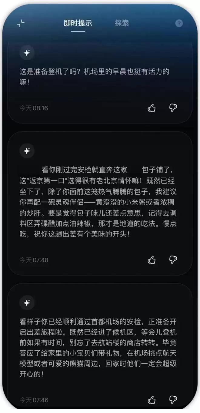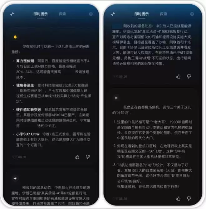 回到候机区,第三波推送到达:一份基于我此前设定的「AI 行业动态」偏好生成的当日新闻摘要:算力涨价、新融资,每条附有我关注的行业关联分析;紧跟着是三条 T3 航站楼的冷知识,最后一条居然是关于天窗采光设计的,因为它记得我偏好「明亮日照办公环境」。