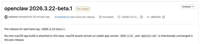 GitHub地址:https://github.com/openclaw/openclaw/releases/tag/v2026.3.22-beta.1
