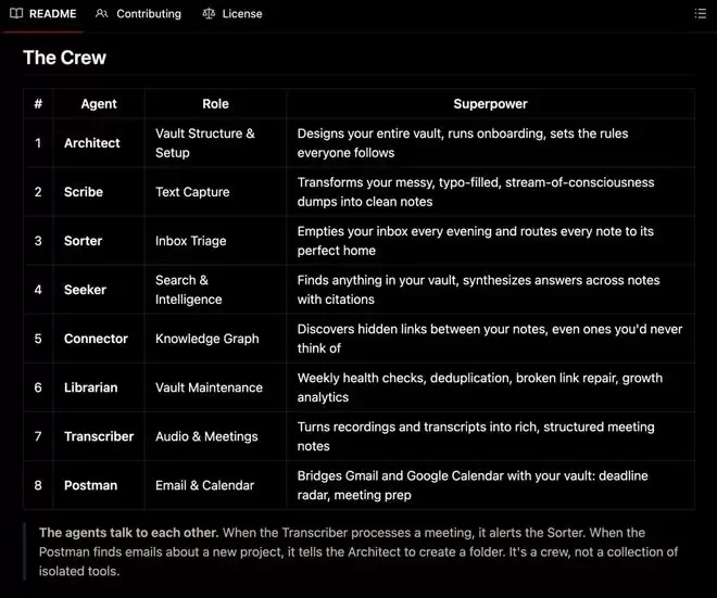 系统由8 个 Agent组成,跑在 Anthropic 的 Claude Code 之上,本地 Obsidian 笔记库里运转。