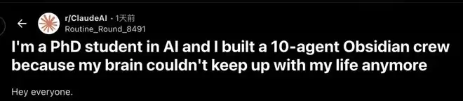 这位 AI 方向的博士生最近在 Reddit 发帖,标题直接点题:《我是 AI 博士生,我因为大脑跟不上自己的生活,搭了一套 10 个 Agent 的系统》。