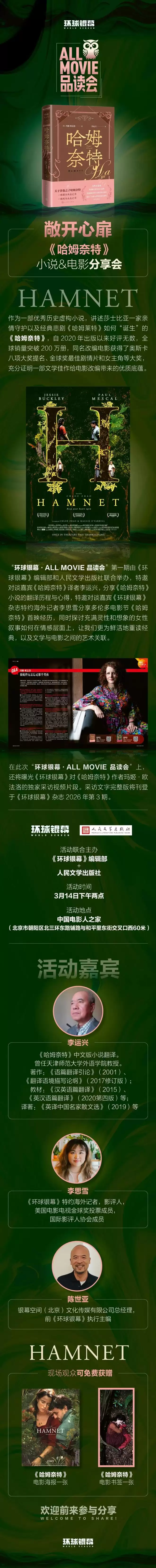 3月14日下午,《环球银幕 》编辑部 将和人民文学出版社一起举办“环球银幕·ALL MOVIE品读会”,分享关于《哈姆奈特》小说和电影的故事!