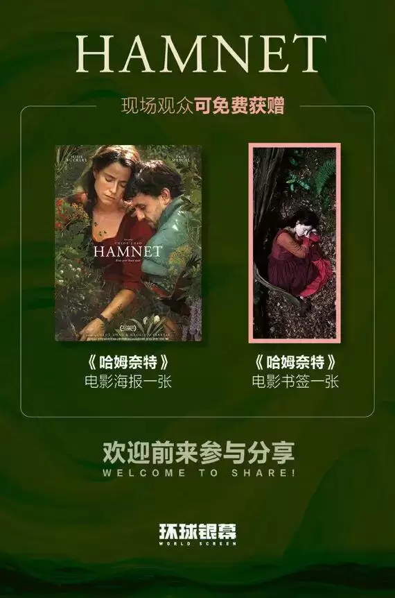 到场观众可免费获得《哈姆奈特》电影海报一张,及《哈姆奈特》电影书签一张!届时还会有《哈姆奈特》原著作者及电影编剧独家专访视频,译者签售,《环球银幕》新刊等诸多惊喜。