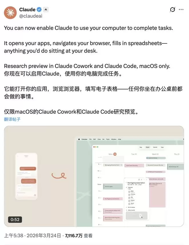 上周 Claude Cowork 就推出了「Dispatch」,允许用户通过手机,远程调用电脑上的 Claude Cowork 去执行任务,更像一个随时可调度的「数字员工」。这周,Claude 更是放出了全新版本的 Computer Use——从功能体验基本可以理解为「Claude 版龙虾」,最新甚至宣称: