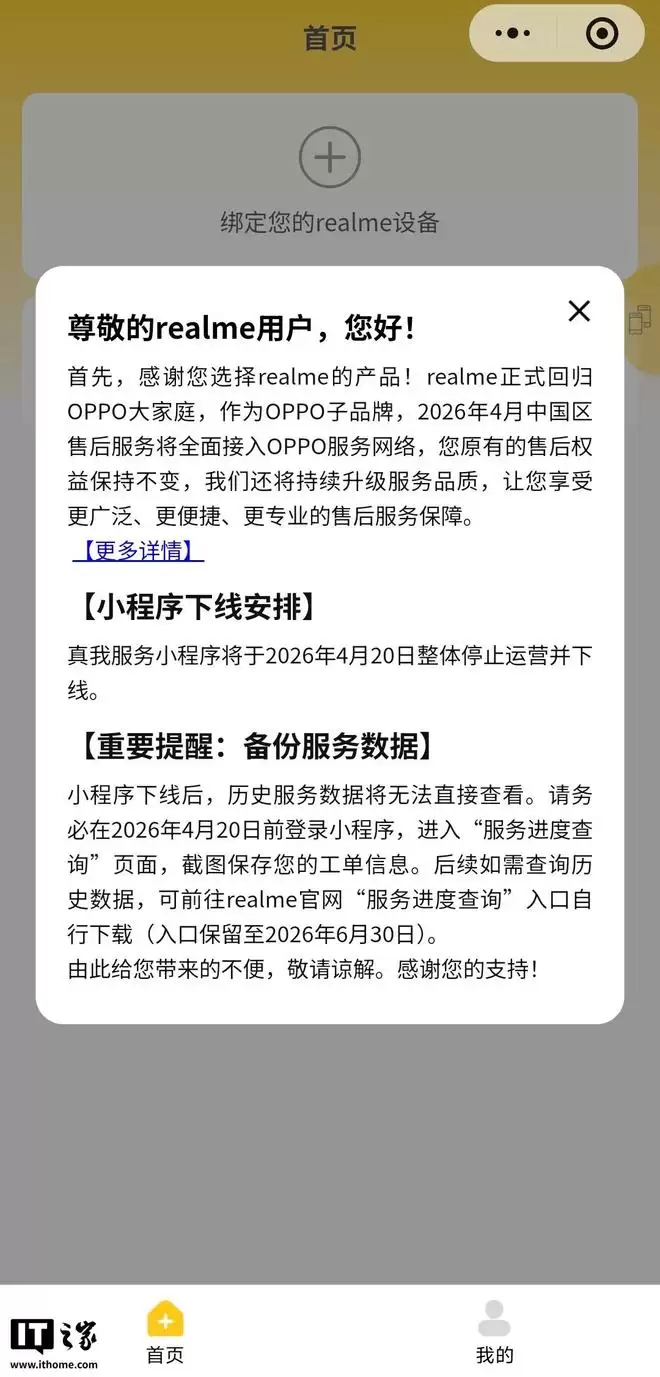 IT之家此前报道,真我最新在 3 月 20 日发布公告,宣布其在中国大陆地区的售后服务将逐步整合至 OPPO 服务体系。自 2026 年 4 月 1 日起,realme 在中国大陆(不含港澳台)的手机、平板、电脑及 IoT 等产品将全面由 OPPO 服务网络提供售后服务。