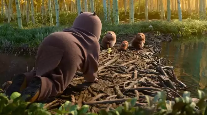 影片还描绘了河狸湿地在火灾中作为野生动物安全区的场景,强调自然手段在应对气候灾难中的潜力,并模拟河狸以小家庭为单位但又互相协作的社会结构,告诉观众关键物种在社区构建中具备巨大的影响力。