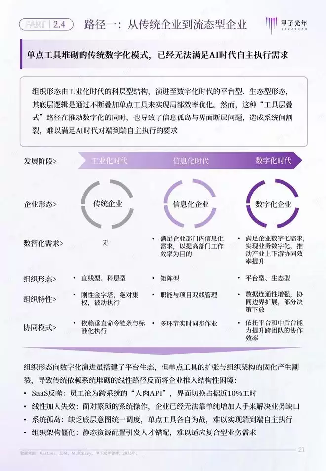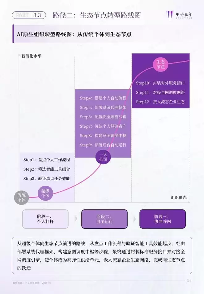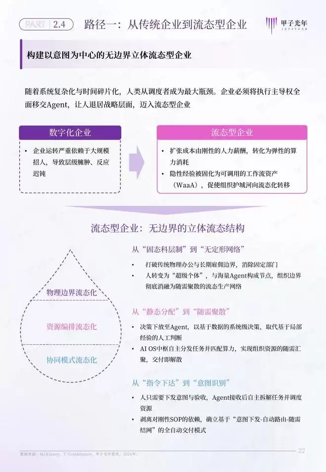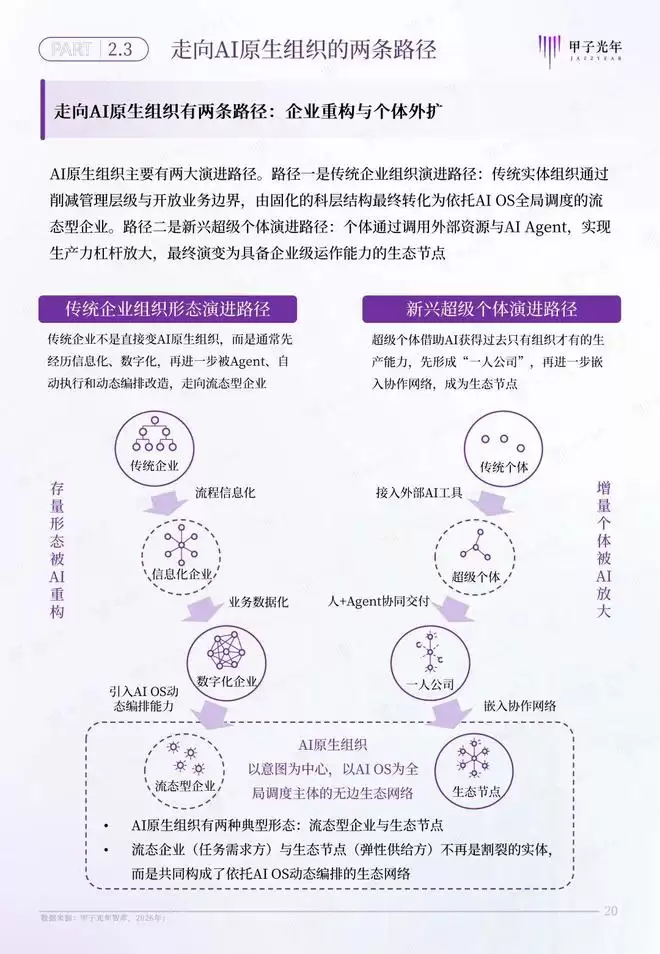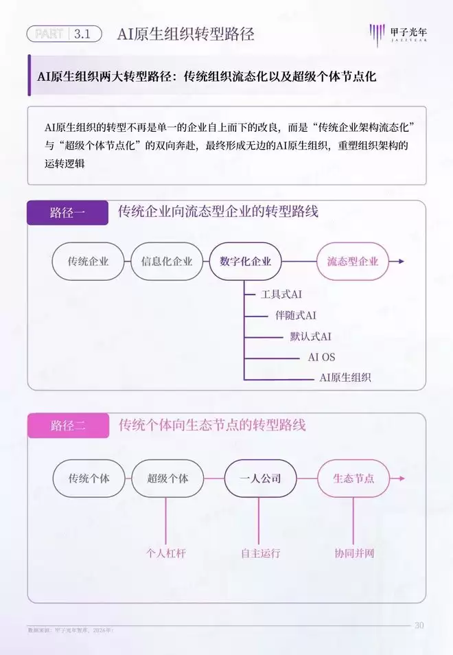 甲子智库希望通过定义AI原生组织,为传统企业和个体转型提供一套完整的转型路线图。为此,本报告特意针对AI原生组织的两条转型路径展开分析,为传统企业向流态型企业,传统个体向生态节点的转型提供参考。