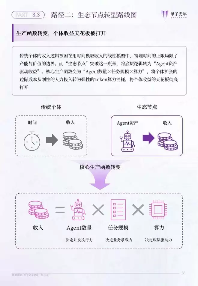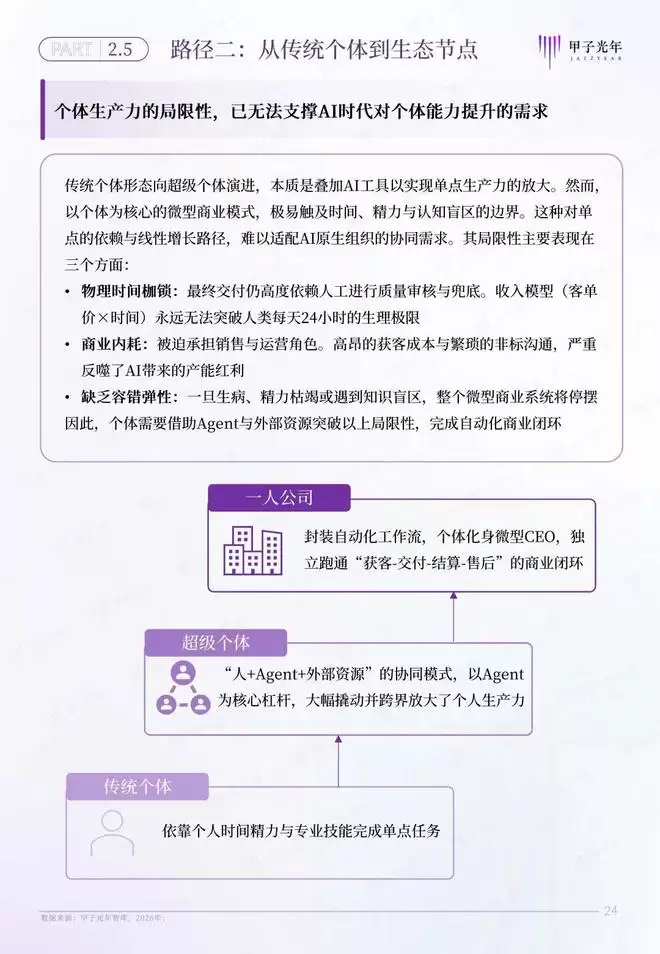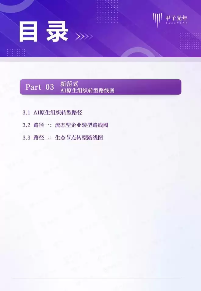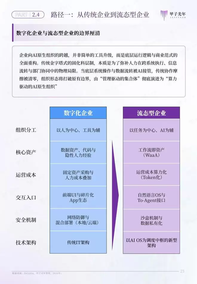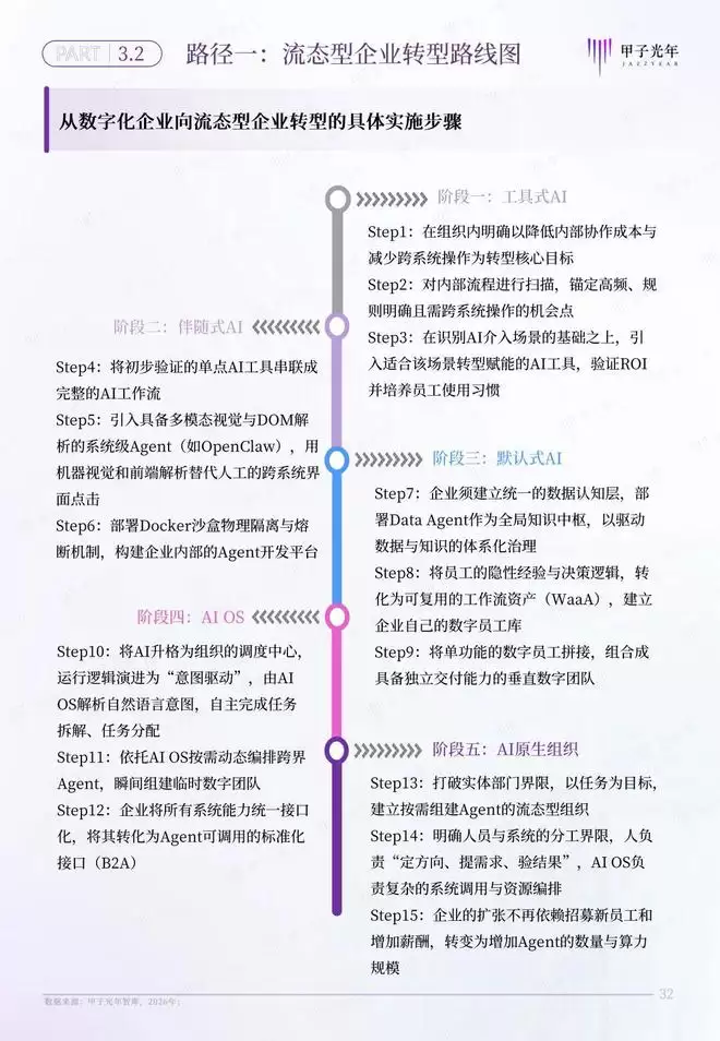 甲子智库希望通过定义AI原生组织,为传统企业和个体转型提供一套完整的转型路线图。为此,本报告特意针对AI原生组织的两条转型路径展开分析,为传统企业向流态型企业,传统个体向生态节点的转型提供参考。