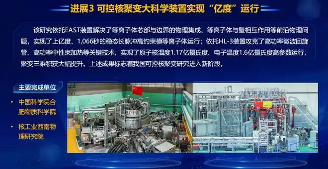 研究成果:中国科学院合肥物质科学研究院east装置实现上亿摄氏度1066秒稳态长脉冲高约束模等离子体运行;核工业西南物理研究院环流器三号装置实现原子核温度1.17亿摄氏度、电子温度1.6亿摄氏度高参数运行。