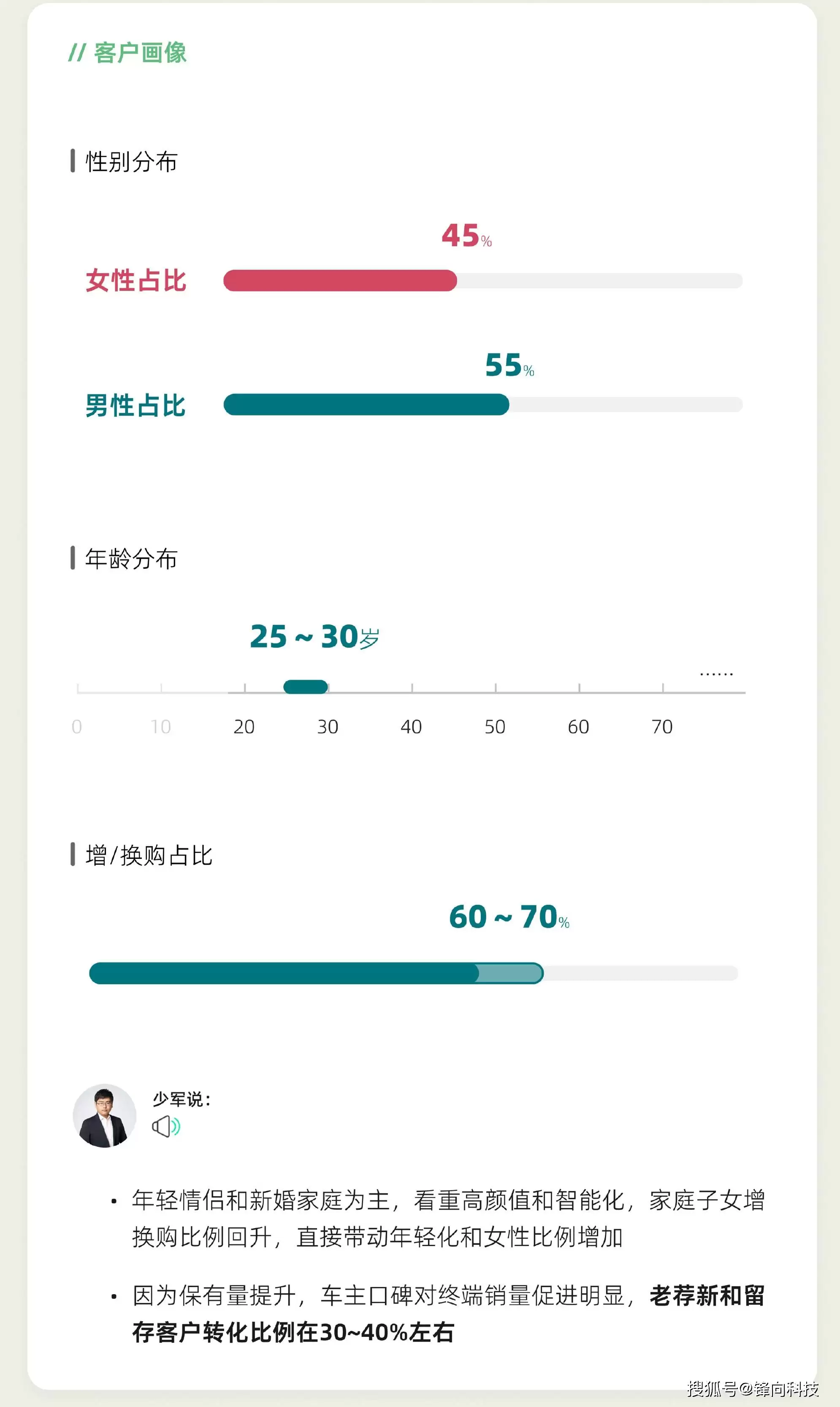 用户画像呈现鲜明特征:20-30岁年轻群体占比达100%,其中女性用户占45%,男性用户占55%。新增用户与换购用户合计占比60-70%,显示出强大的市场拓展能力。特别值得关注的是,老车主推荐与留存客户转化率高达30-40%,形成独特的口碑传播效应。分析认为,年轻情侣和新婚家庭构成核心消费群体,他们对车辆颜值设计和智能配置的关注度远超传统购车指标。