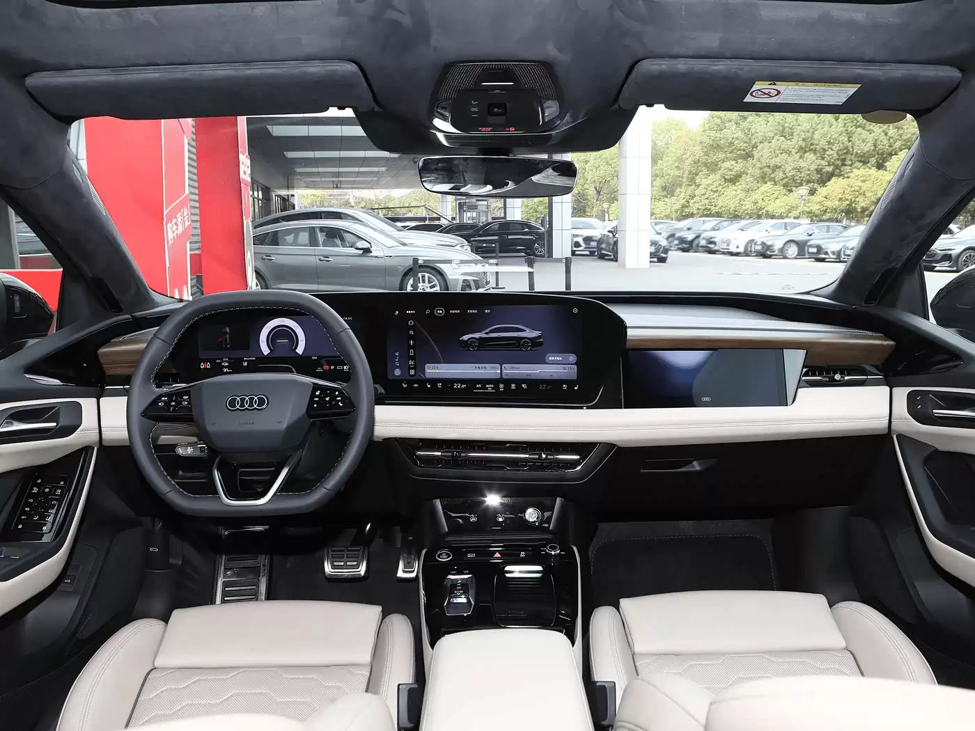 外观采用奥迪最新家族设计语言,标志性大嘴中网与分体式大灯组形成视觉焦点。上方LED日间行车灯支持8种动态图案切换,下方远近光灯组与中网无缝融合,头灯两侧集成激光雷达模块。尾部搭载第二代OLED贯穿式尾灯,可呈现8种变换灯语,事故状态下自动显示警示符号,夜间可点亮发光LOGO,进一步强化品牌辨识度。