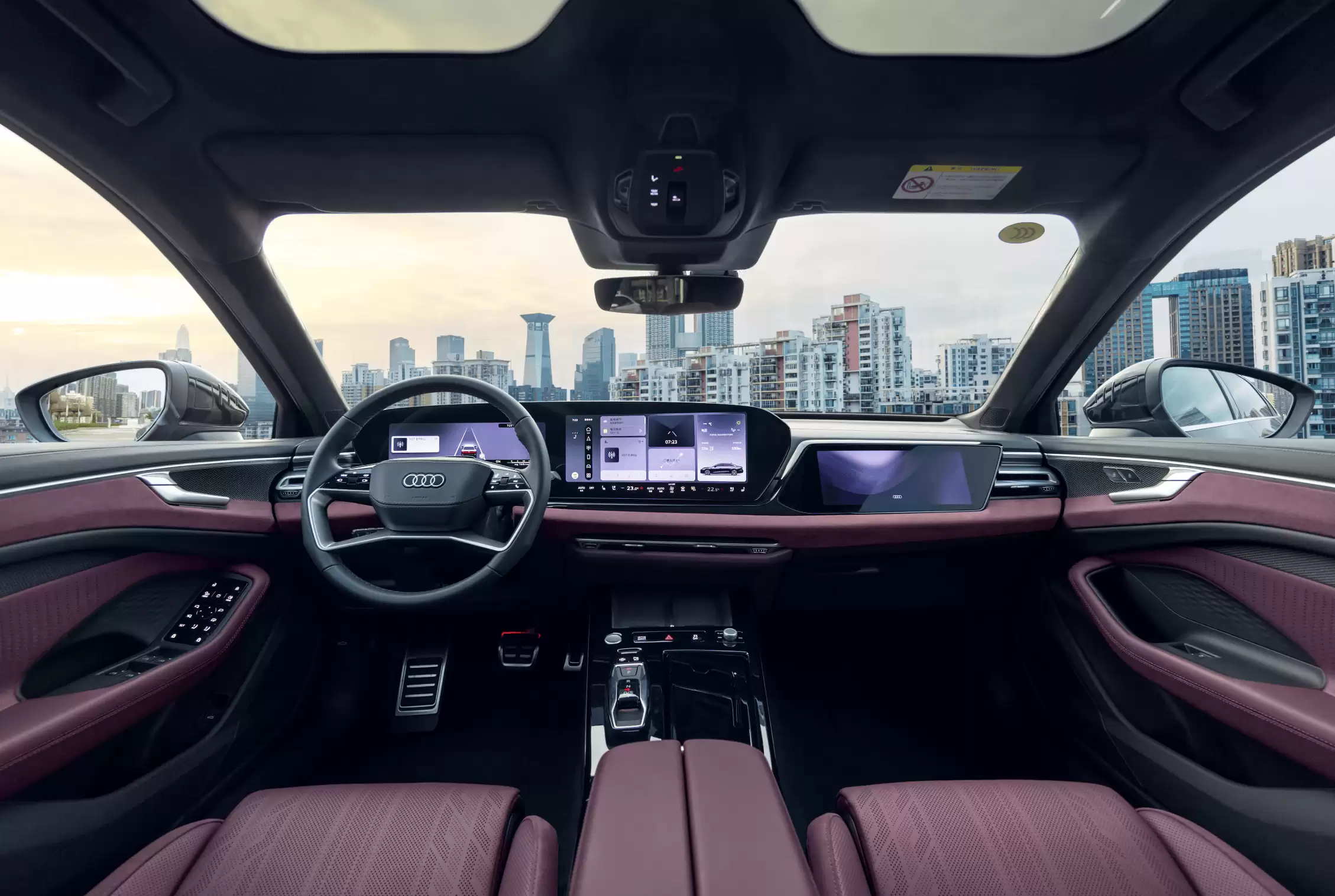 智能座舱成为本次升级的核心亮点,新车配备由14.5英寸MMI全景显示屏、11.9英寸虚拟驾驶舱、13.1英寸W-HUD抬头显示、10.9英寸副驾娱乐屏及手机互联组成的五屏交互系统。9分区智能全景天幕覆盖面积达1.96平方米,支持毫秒级响应与九段独立控制。内饰氛围系统新增奥迪银河星空顶配置,在全景天窗两侧集成112颗RGB LED光源,可实现30种色彩组合变换,并与车内环境照明系统形成联动效果。