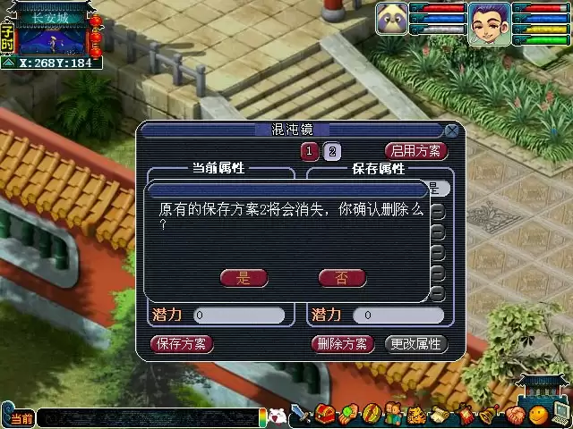 玩家升级后,保存在混沌镜中的属性方案已经会获得相应的潜力点。保存在混沌镜中的方案有潜力点则无法进行属性更换,需要将保存的方案里的潜力分配完毕才能进行更换操作,保存的方案每点潜力点分配需要消耗5万两。