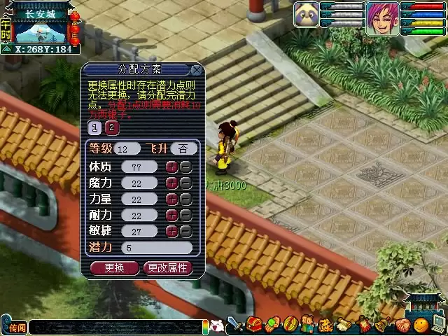 玩家可以到长安云游仙人(264,185)处,保存自己的当前属性点分配方案,只需通过一定消耗便可更换成原来所保存的属性分配方案,保存次数不限,保存方案三套,每天更换属性次数暂定两次。