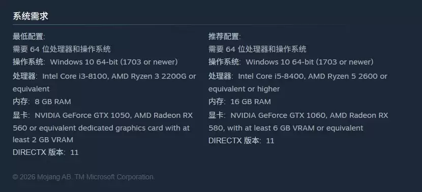 Steam商店页面还附上了游戏的配置需求,《我的世界:地下城 2》在这块还是比较友好的:最低配置为酷睿 i3-8100 或 AMD 锐龙 3 2200G,运行内存 8GB,显卡为 GTX 1050 或 Radeon RX 560 级别;推荐配置为酷睿 i5-8400 或 AMD 锐龙 5 2600,运行内存提升至 16GB,显卡为 GTX 1060 或 Radeon RX 580级别。不过硬盘空间需求暂缺,我们不知道这款游戏到底有多大。