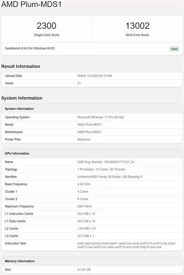 一个值得关注的技术细节是,Geekbench的检测信息显示,Zen 6架构首次支持FP16 “AVX-VNNI”指令集。这意味着新一代APU将具备完整的半精度浮点运算能力,有望在AI相关负载和计算性能上实现显著提升。
