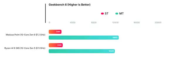 与现有产品对比,这一成绩更显突出。以搭载Zen 5架构的Strix Point产品——锐龙AI 9 365为例,其在达到5GHz加速频率的情况下,多核平均成绩仍落后于这款仅以2GHz运行的Zen 6样片约4.4%,仅在单核性能上领先约8%。这一对比表明,Zen 6架构的IPC(每时钟周期指令数)实现了相当可观幅度的增长。
