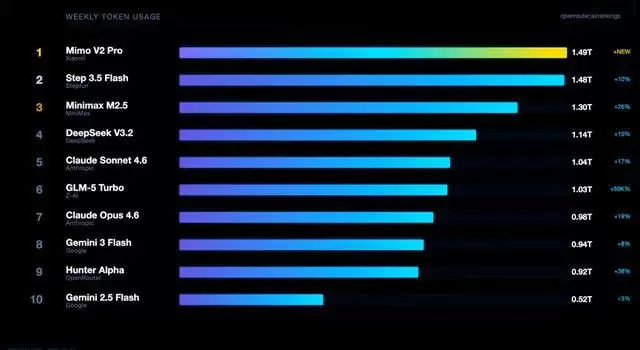 更值得关注的是,在全球词元调用榜单中,国产大模型已取代ChatGPT、Gemini、Claude等美国模型,小米MiMo、阶跃Step、MiniMax与DeepSeek等国产模型占据主导位置。