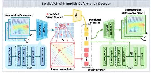 TactileVAE:通过时空联合编码与隐式函数解码,将高频、稠密的触觉3D形变压缩为低维连续潜变量表示,如下图所示。