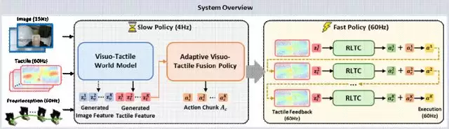反射式触觉控制器(执行模块):基于预测触觉与实时触觉反馈,在 60 Hz 高频下输出单步修正动作,对慢系统生成的动作序列进行连续闭环补偿。