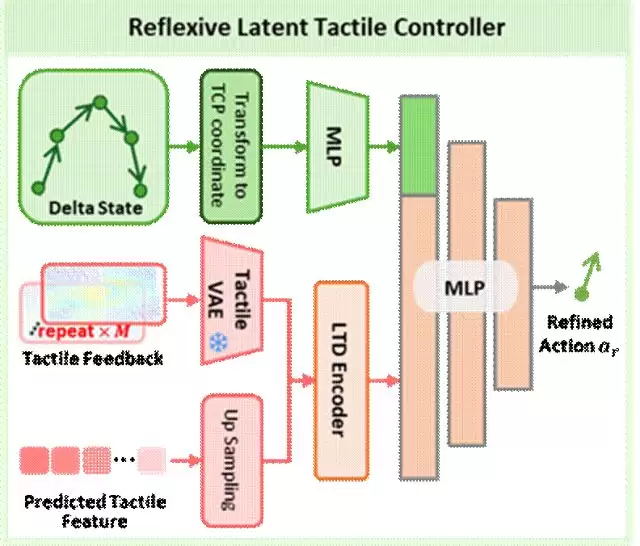 该控制器通过建模触觉误差(预测–观测差异)实现快速响应,可在接触扰动、物体偏移或摩擦变化等情况下即时修正执行轨迹,从而显著提升操作稳定性与精度。