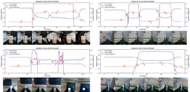 如下图所示,模型能根据预测的接触状态自适应调整视觉与触觉的权重,并在不同物体和工具下保持稳定表现。