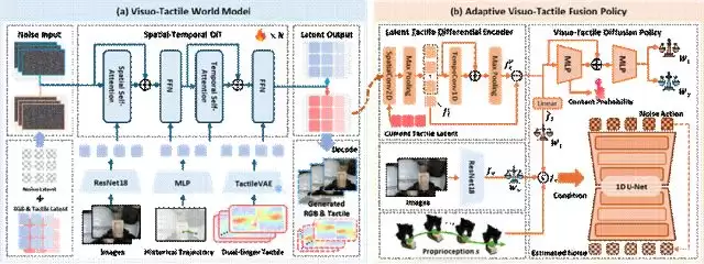 视触觉世界模型(预测模块):基于双流扩散生成架构,在共享条件约束下联合建模视觉与触觉的时序演化关系。