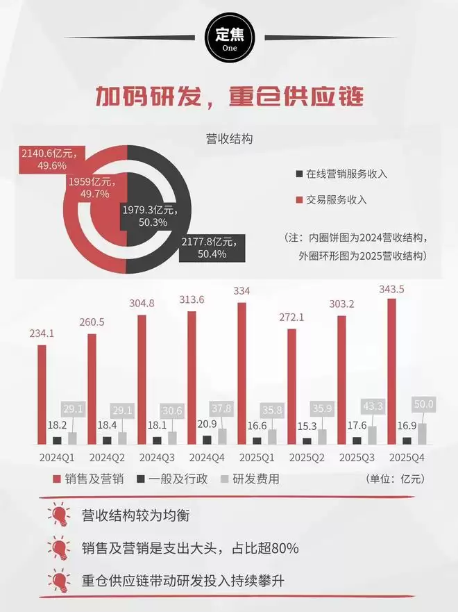 业务结构上,2025年在线营销与交易服务占比分别为50.4%和49.6%,较2024年的50.3%、49.7%几乎持平,结构较稳定。现金流方面,全年经营活动现金流1069.4亿元,同比减少12.3%,但仍维持在千亿级别。