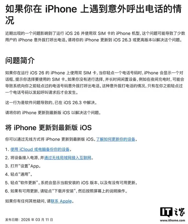 IT之家 3 月 26 日消息,苹果公司于 3 月 11 日更新支持文档,回应少数 iPhone 用户遇到意外呼出电话的情况,并推荐受影响用户升级到 iOS 26.3 及更高版本,来解决这个问题。