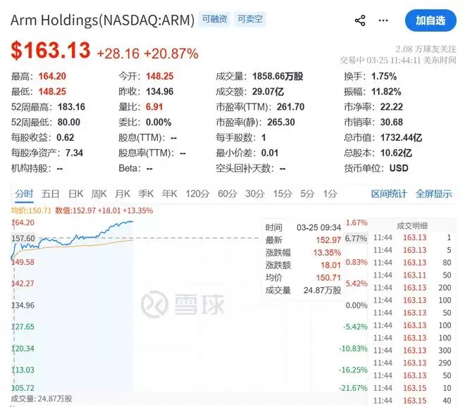 当晚美股最受瞩目的个股,应该是芯片设计公司ARM,其股价暴涨超过20%。