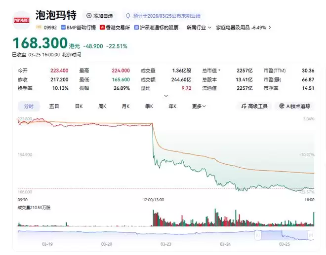 3月25日,潮流文化娱乐公司泡泡玛特(09992.HK)公布2025年业绩显示,其营收同比大增184.7%,然而下午开盘股价跳水,收报168.30港元,跌幅22.514%。