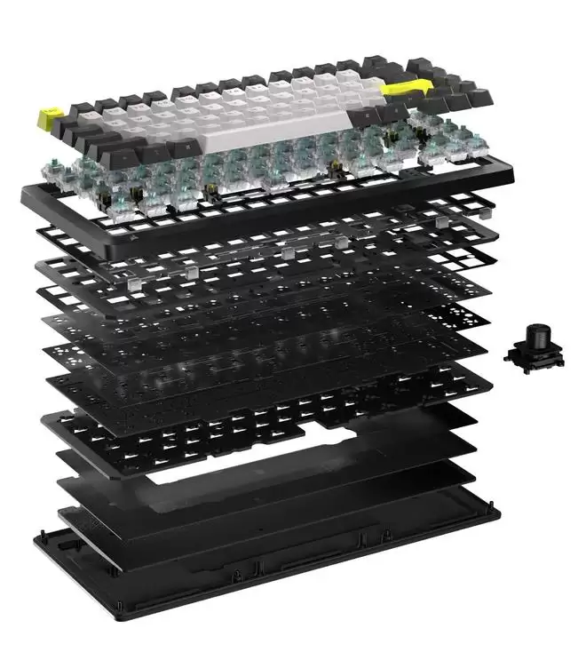 这款键盘外部为全铝精加工机身,配备可扩展屏幕模块,内部为 Gasket 结构,拥有 FR4 定位板和 8 层消音结构。
