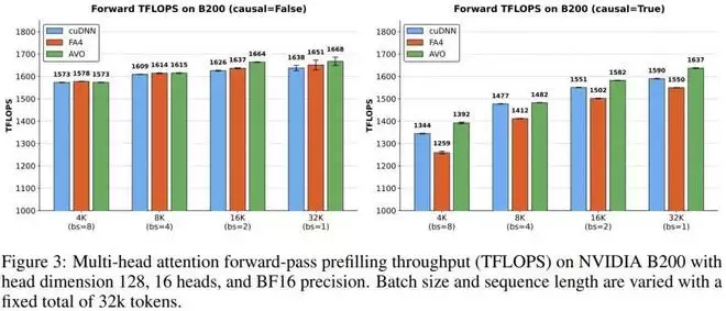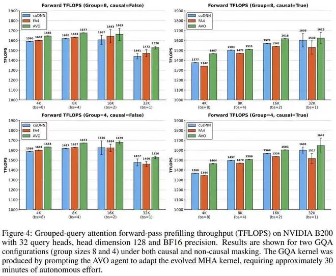 为了验证其有效性,英伟达将 AVO 应用于NVIDIA Blackwell B200 GPU上的多头注意力(MHA)内核,并直接与专家优化的 cuDNN 和 FlashAttention-4 内核进行对比。在无需人工干预、长达 7 天的连续自主演化中,智能体探索了超过 500 个优化方向,演化出 40 个内核版本。最终生成的 MHA 内核在 BF16 精度下达到了最高1668 TFLOPS的吞吐量,在测试配置中分别超越 cuDNN 高达3.5%,超越 FlashAttention-4 高达10.5%