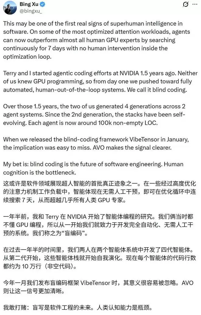 有意思的是,在 X 推文中,许冰还分享说一年半之前他与 Terry Chen 刚开始在英伟达研究智能体编程时,他们还不懂 GPU 编程,「所以从一开始我们就致力于开发完全自动化、无需人工干预的系统。」他们称之为「盲编程(blind coding)」。