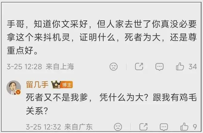 显而易见,留几手这篇长文的评论区又翻车了,铁粉苦口婆心劝他别拿别人离世抖机灵证明个人价值,还是要尊重死者。留几手直接回怼“死者又不是我爹,凭什么为大?跟我有什么关系”,言语中的傲慢与狂妄扑面而来。